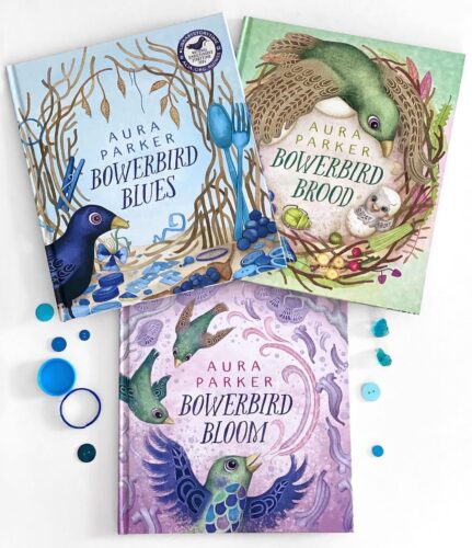Bowerbird Blues was chosen for ALIA National Simultaneous Storytime in 2024 and read by 2.3 million people at the same time, inspiring a wave of blue art and craft. Aura has since created two more for the series, Bowerbird Brood and newly released Bowerbird Bloom (November 2025).